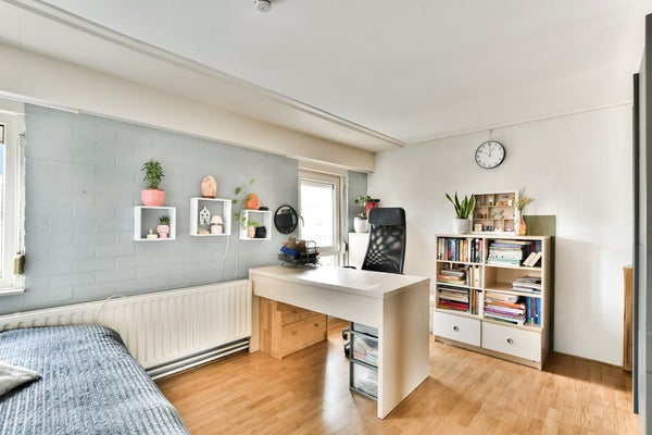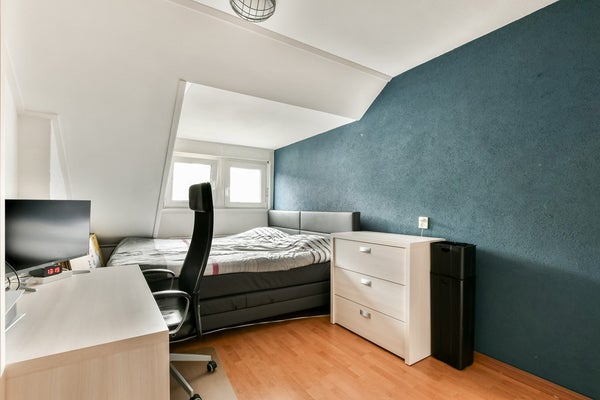 Vanaf de overloop, voorzien van een Velux-dakraam en bergruimte achter de knieschotten, is er toegang tot de vierde slaapkamer en de technische ruimte. Dankzij de dakopbouw aan de achterzijde is de vierde slaapkamer riant van formaat. Ook deze kamer is uitgerust met kunststof kozijnen en rolluiken. De technische ruimte biedt plek aan de CV-ketel en een trap naar de bovengelegen royale bergvliering met een nokhoogte van ca. 1.28m.