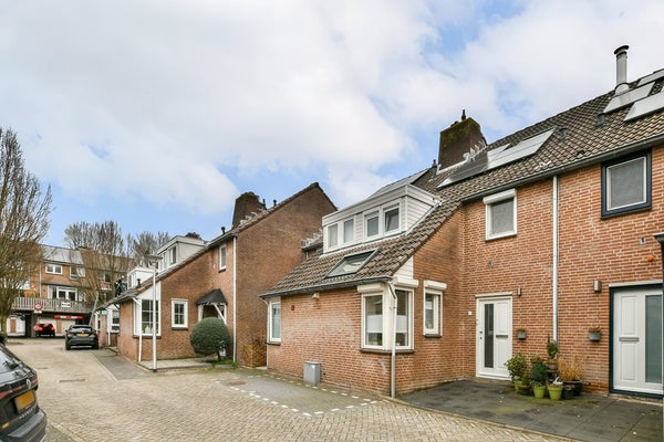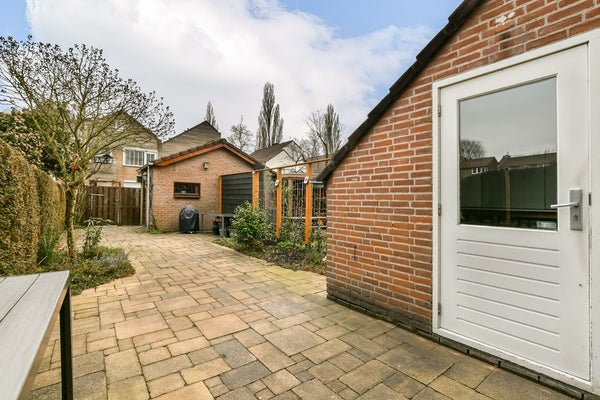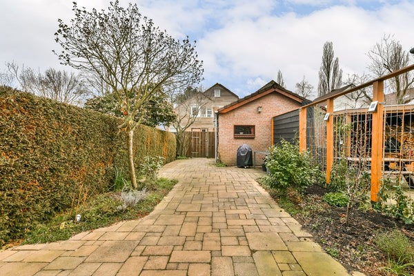De op het oosten gelegen achtertuin is v.v. een zonnescherm en is grotendeels betegeld met aan weerszijden een plantenborder. Achter op het perceel bevindt zich de stenen berging. Het aansluitende tweede perceel (16 m²) biedt praktische ruimte voor de kliko's en de achterom naar het speeltuintje en het aangrenzende park.
