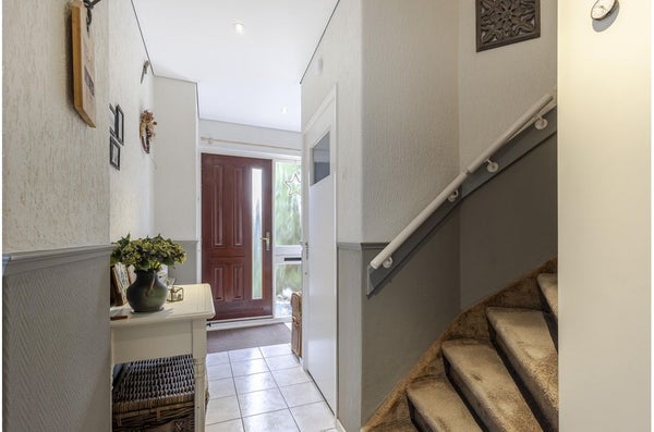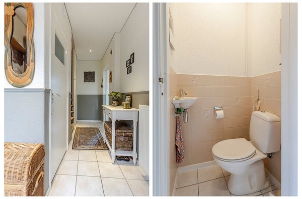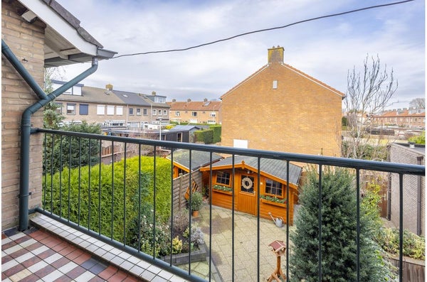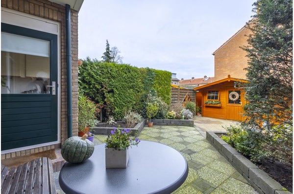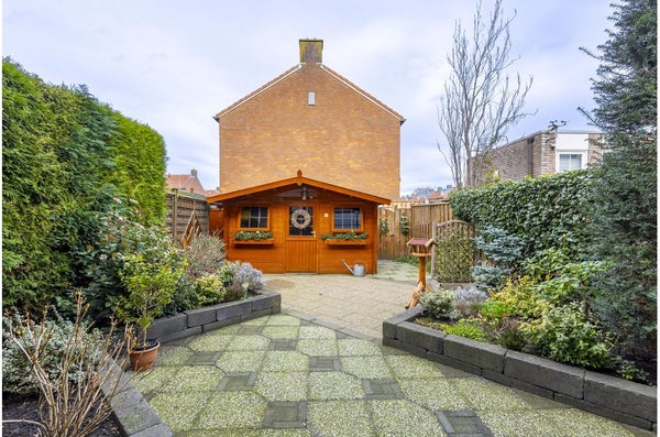 De hal fungeert als centraal punt, met toegang tot toilet, voorraadkast en een lichte doorzonwoonkamer. De keuken is praktisch en heeft toegang tot de tuin. Op de verdiepingen bevinden zich vier slaapkamers, een volledig betegelde badkamer en een vergrote slaapkamer op de tweede verdieping. De achtertuin is fraai aangelegd en achterin staat een ruime houten blokhut voor extra opslag.