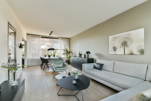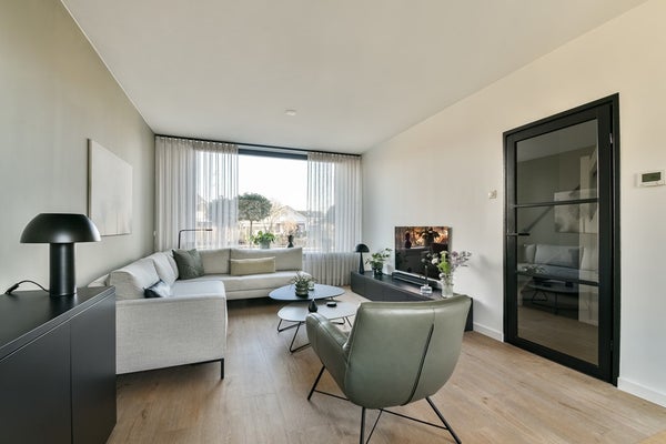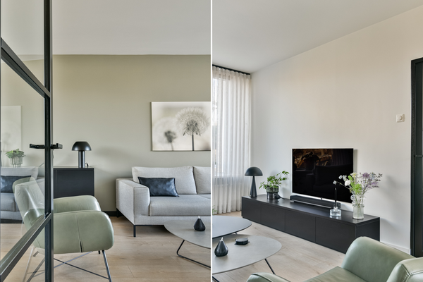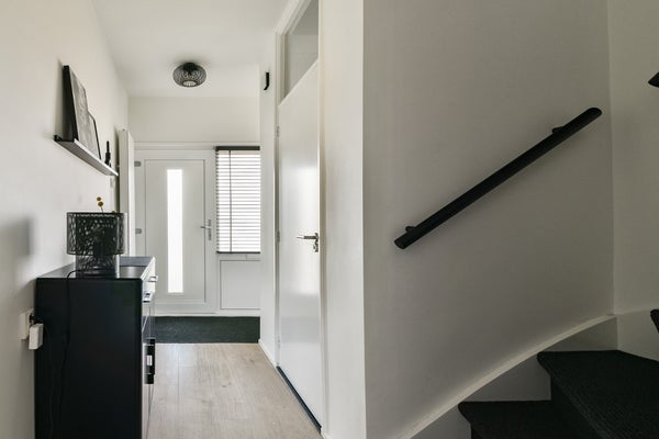 Middels de overdekte entree toegang in de hal met de garderoberuimte, de meterkast, de nette en volledige betegelde toiletruimte v.v. een zwevend toilet + een fonteintje en de trapopgang met trapkast. Via een mooie paneeldeur toegang tot de riante doorzonwoonkamer. Grote raampartijen aan zowel de voor- en achterzijde zorgen voor veel natuurlijk licht, terwijl de strak afgewerkte (PVC) vloer, wanden en plafond bijdragen aan de frisse uitstraling. Beide raampartijen zijn voorzien van elektrische screens voor zonwering en privacy. De halfopen keuken in L-opstelling is drie jaar geleden geplaatst en voorzien van moderne apparatuur, waaronder een inductiekookplaat met geïntegreerde afzuiging, een koel-vriescombinatie, een combi-oven en een vaatwasser. De gestucte wanden zorgen ook hier voor een frisse uitstraling. Vanuit de keuken toegang tot de achtertuin.
