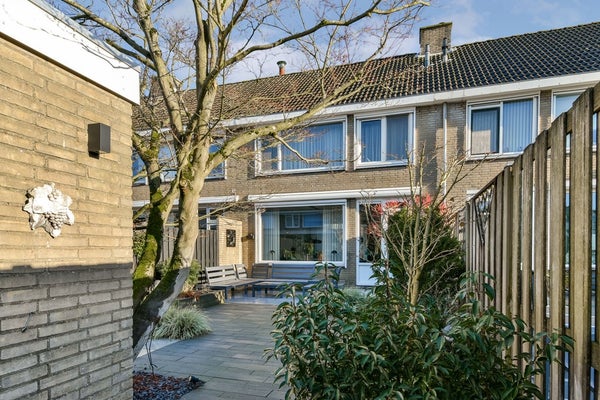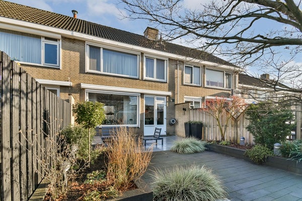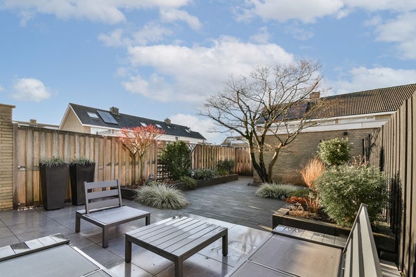De zonnige (westen) achtertuin is verzorgd aangelegd met een afwisseling van sierbetegeling en aan weerszijden opgemetselde plantenborders met een grote variatie aan bomen, siergrassen en vaste beplanting. Het zonnescherm aan de achtergevel zorgt voor de nodige schaduw op zomerse dagen. Achterop het perceel staat de ruime stenen berging v.v. elektra. Hier bevindt zich tevens de achterom naar de achtergelegen brandgang.
