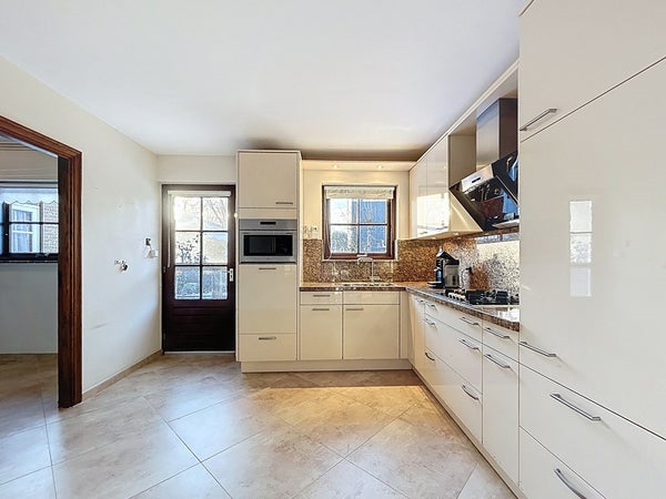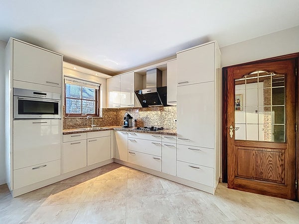 De gesloten keuken is ruim en praktisch ingericht met veel kastruimte en plek voor een eettafel. De keuken is voorzien van diverse inbouwapparatuur, waaronder een combi-oven, koelkast, gasfornuis, afzuigkap en een recent vernieuwde vaatwasmachine.