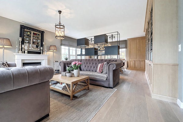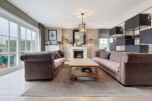 Via de entree met gastentoilet en meterkast betreedt u de woning, met directe toegang tot de inpandige dubbele garage. De royale hal, ingericht als sfeervolle zit- en leeshoek met speelruimte, biedt plaats aan een fraaie eiken trapopgang en is voorzien van een doorlopende eiken parketvloer naar het woongedeelte. De woonkamer is een ruimte waar karakter en geborgenheid samenkomen. De open haard met sierlijke schouw nodigt uit tot lange avonden bij knisperend vuur, omringd door maatwerk eiken wandkasten en verfijnde radiatorkasten die het geheel een tijdloze charme geven. Hier is alle ruimte voor een royale zithoek en een grote eettafel, waar diners moeiteloos overgaan in intieme gesprekken tot laat in de avond. De royale raampartijen en de schuifdeur naar het terras laten het daglicht rijkelijk binnenstromen en vervagen de grens tussen binnen en buiten, zodat het groen van de tuin altijd dichtbij voelt.