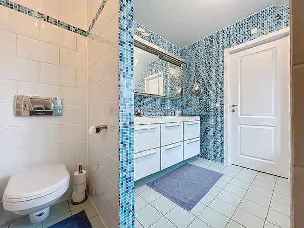 Aangrenzend vindt u de praktische bijkeuken met wasmachineaansluiting en toegang tot de tuin, een discrete en functionele aanvulling op deze sfeervolle leefruimte.