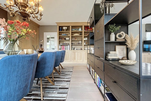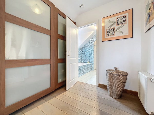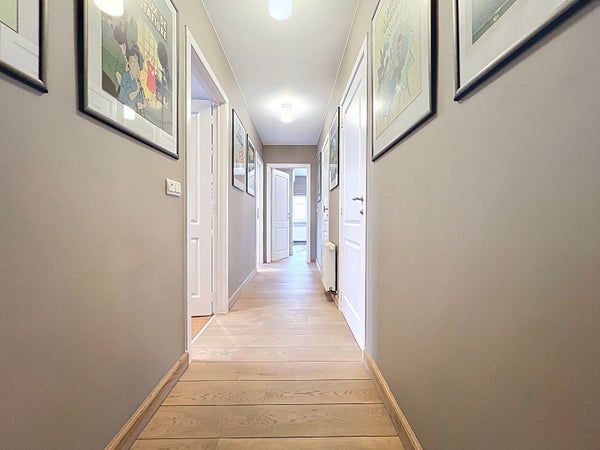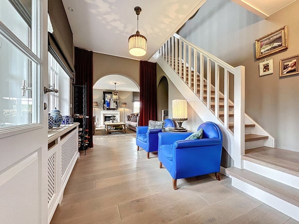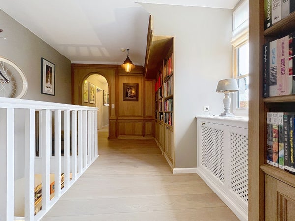 Via de elegante eiken trap bereikt u de eerste verdieping. De overloop ademt karakter dankzij de ingebouwde eiken bibliotheekkast en verfijnde wandafwerking een plek waar boeken, herinneringen en verhalen samenkomen.
