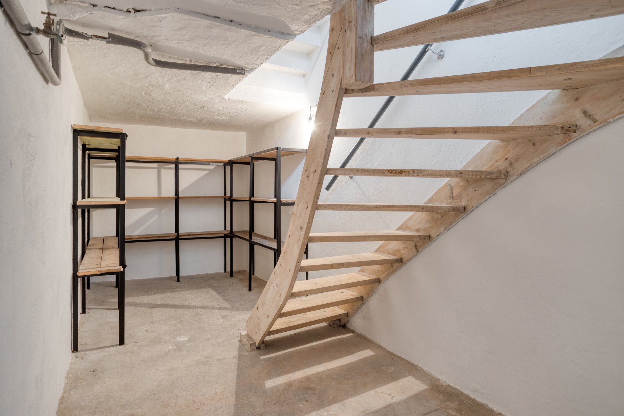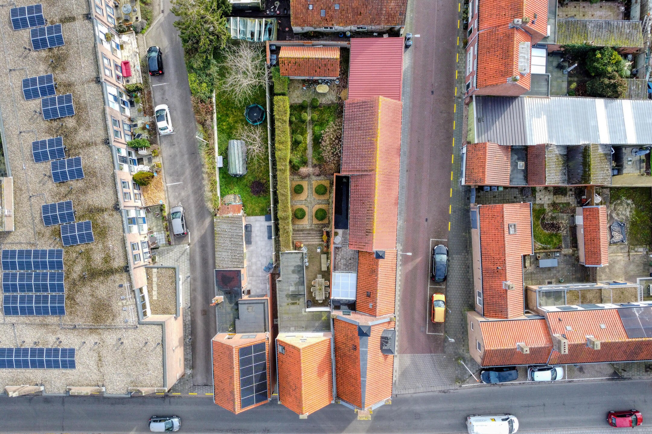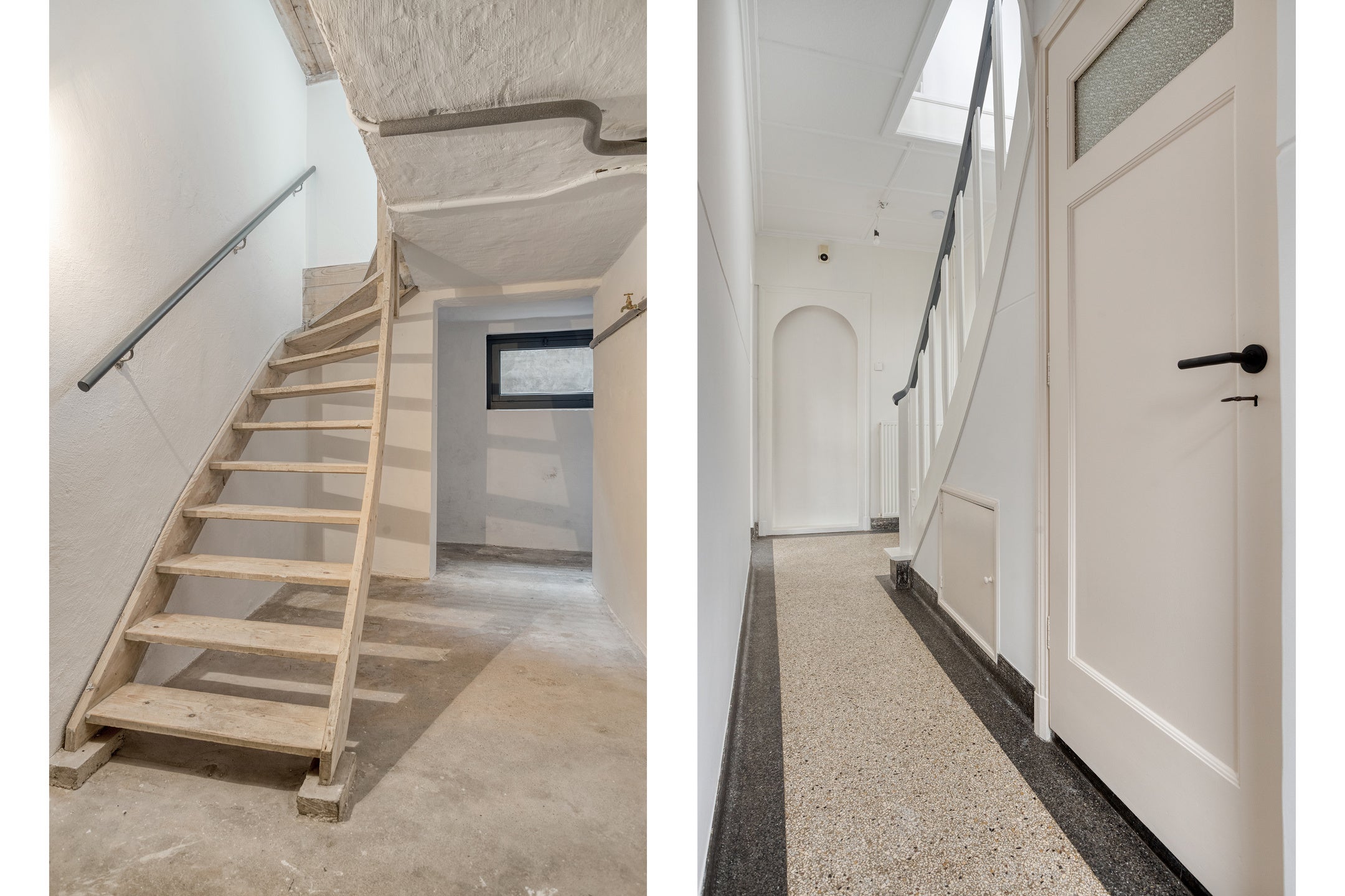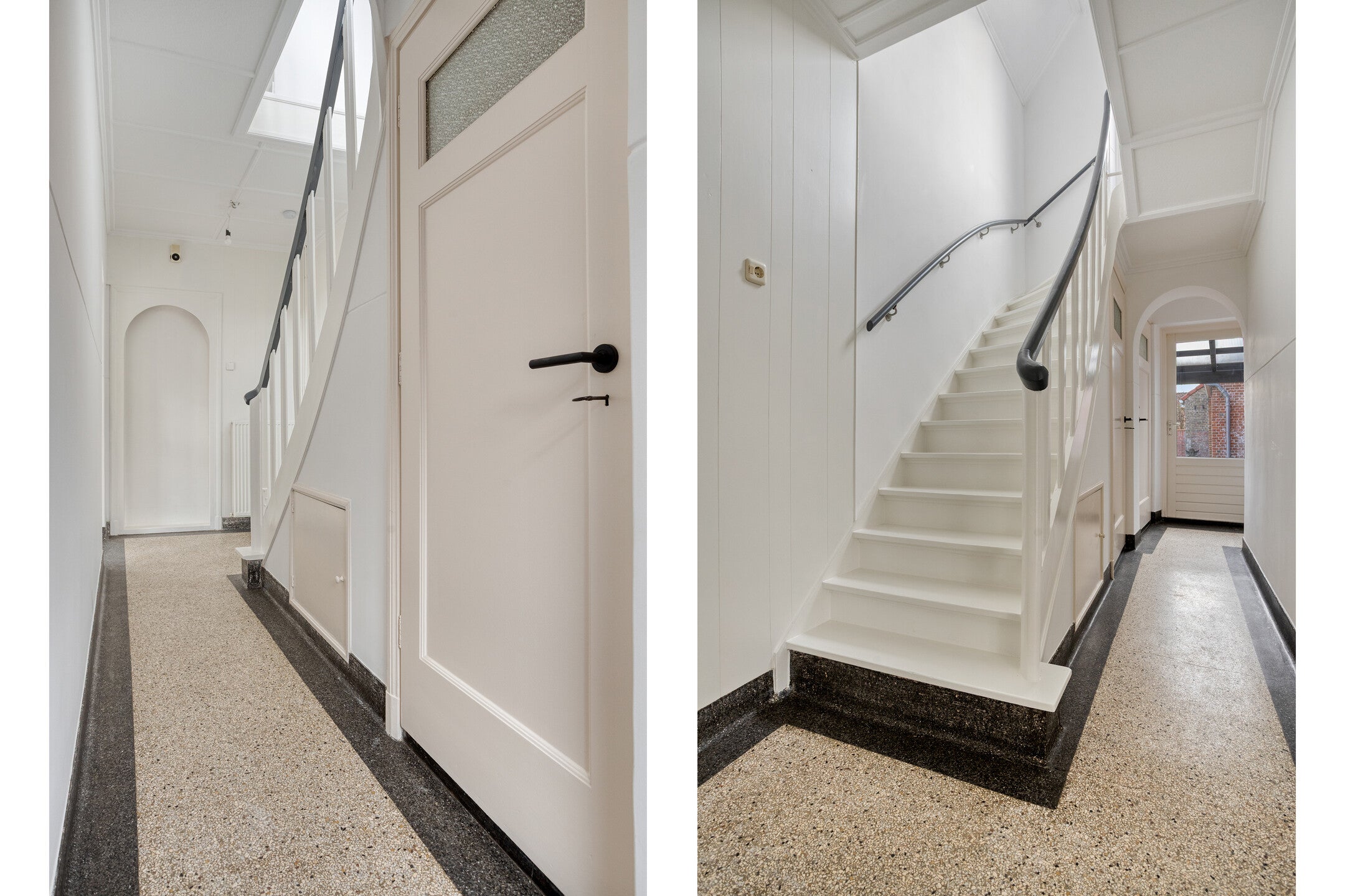 Op de begane grond vindt u de lichte woonkamer met veel raampartijen, die in open verbinding staat met de keuken, uitgerust met een inbouwkast, gasfornuis en koelkast. De ruime badkamer biedt toegang tot de stadstuin. Via de tussenhal zijn er een toilet, kelder en trap naar de eerste verdieping. Hier zijn drie slaapkamers, met een overloop die toegang biedt tot een klein balkon.