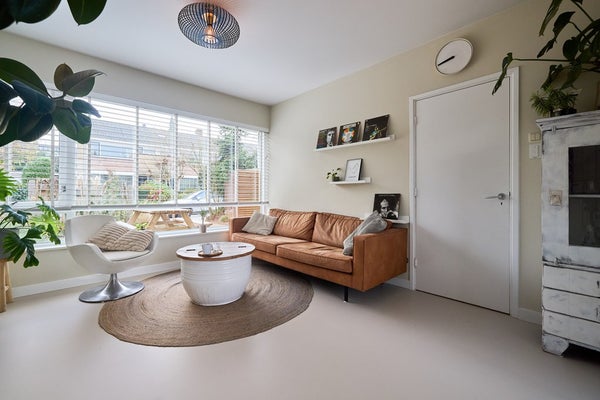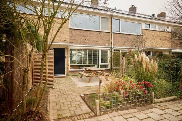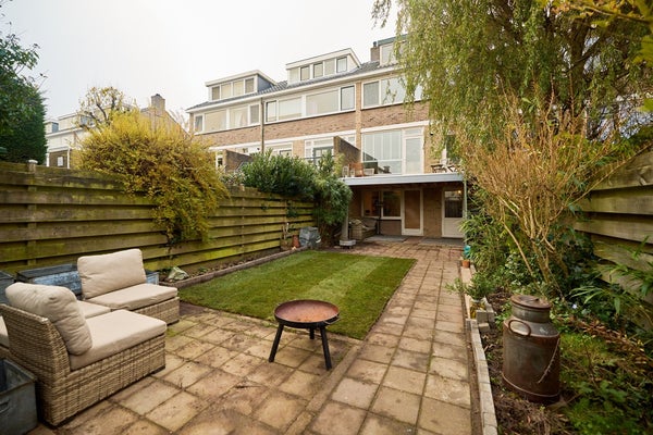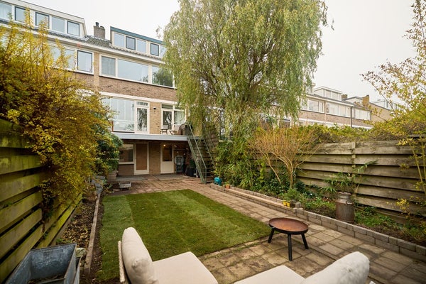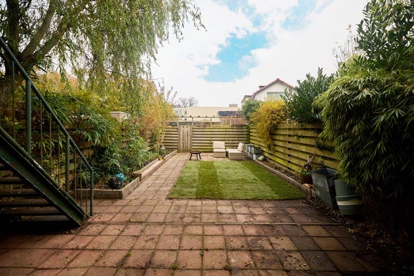 Aan de voorzijde van de woning ligt een zonnige voortuin op het zuiden, waar je een fijne zitplek kunt creëren en volop van de zon kunt genieten. De achtertuin is verzorgd en praktisch aangelegd, met een combinatie van bestrating, beplanting en een gazon. Dankzij de ligging op het noorden blijft het ook op warme dagen aangenaam. Via de achterom is de tuin goed bereikbaar en is er bovendien een eigen toegang tot het souterrain, ideaal voor multifunctioneel gebruik. Op de eerste verdieping bevindt zich een ruim dakterras, direct grenzend aan de woonkamer. Een fijne plek voor ontbijt, borrel of een ontspannen moment in de buitenlucht. Met de trap vanaf het terras loop je zo de tuin in; een prettige verbinding tussen binnen en buiten.
