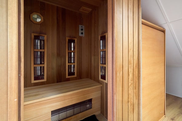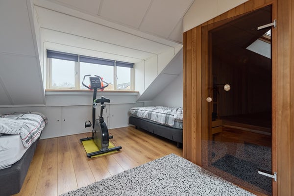 Op de eerste verdieping zijn drie slaapkamers en een ruime inloopkast op de overloop. Hier hangt ook een airco-unit die zorgt voor extra verkoeling op warme dagen. De tweede verdieping biedt een vierde slaapkamer met veel daglicht, een eigen sauna en aansluitingen voor wasmachine en droger.