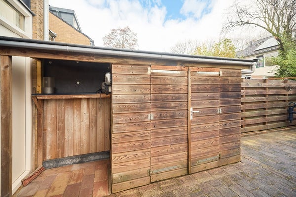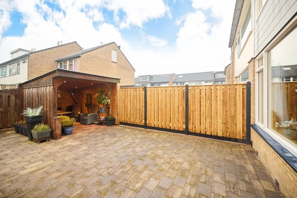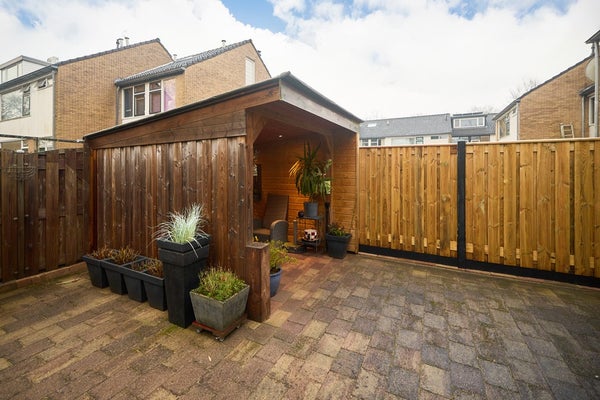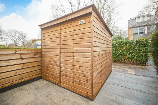 De tuin is onderhoudsvriendelijk aangelegd en heeft een sfeervolle houten overkapping met verlichting. Een fijne plek om ook bij minder weer buiten te zitten. Achterin de tuin bevindt zich een praktische opslagruimte met elektra, aan de voorzijde van de woning is een ruime berging, eveneens met elektra, ideaal voor fietsen of gereedschap. De achtertuin ligt op het noordoosten en is bereikbaar via een achterom. De voortuin ligt op het zuidwesten en biedt plek om van de middag- en avondzon te genieten.