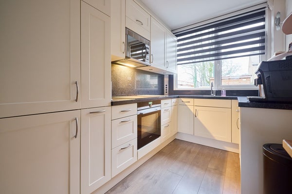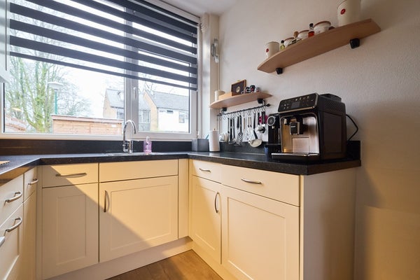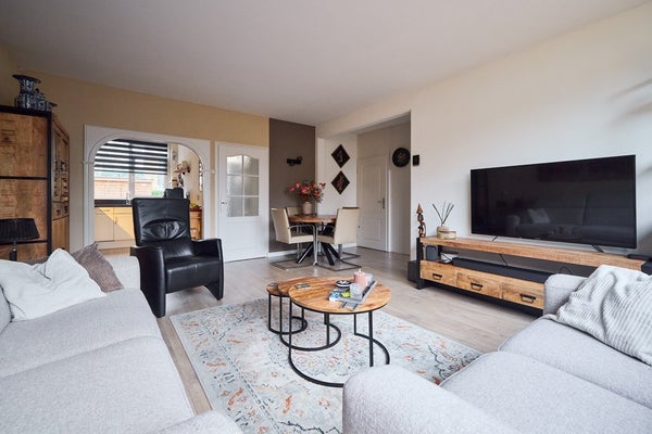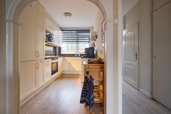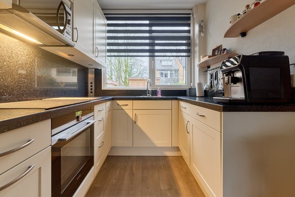 Bij binnenkomst stap je in een ruime entree die leidt naar de hal. Hier vind je het verzorgde toilet met neutrale wandtegels en een handige nis voor accessoires. Ook is hier de meterkast gesitueerd, overzichtelijk en goed bereikbaar. Vanuit de hal loop je door naar de woonkamer, die aan de achterzijde van de woning ligt. Deze ruimte is licht en ruim, met een doorlopende laminaatvloer in warme houttint die zorgt voor een rustige en verzorgde uitstraling. Er is voldoende plek voor een comfortabele zithoek én een eettafel. Aansluitend ligt een extra kamer, ontstaan doordat de voormalige berging bij de woning is getrokken – ideaal als werkplek, speelruimte of rustige zitkamer. Aan de voorzijde bevindt zich de keuken. Vanuit het raam heb je prettig zicht op het groen en het autovrije pad voor de woning. De keuken is praktisch ingericht en voorzien van een 4-pits inductiekookplaat, afzuigkap, vaatwasser, koelkast, vriezer en twee combimagnetrons – alles wat je nodig hebt voor dagelijks gemak.