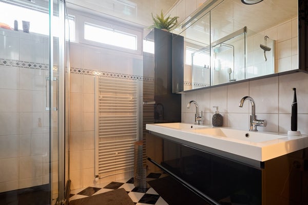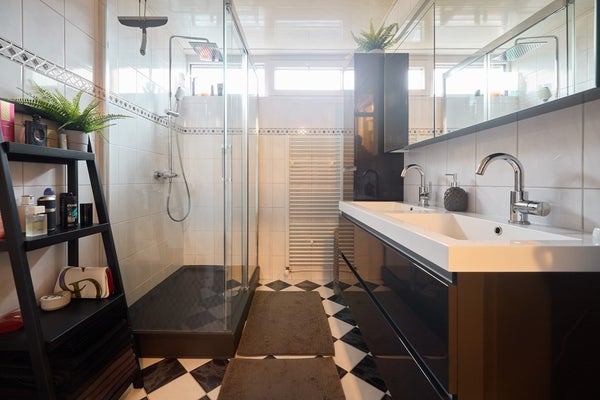 Op de eerste verdieping bevinden zich drie slaapkamers, allemaal prettig van formaat en voorzien van veel daglicht. Op de overloop is een ruime inloopkast gecreëerd, ideaal voor kleding of extra bergruimte. Ook hangt hier een airco-unit, die op warme dagen voor verkoeling zorgt. De badkamer is compleet en modern uitgevoerd met een inloopdouche, toilet, dubbele wastafel en een designradiator.
