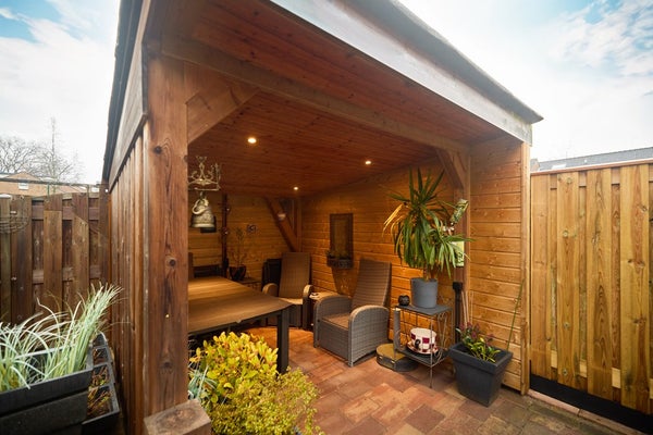 De tuin is onderhoudsvriendelijk aangelegd en heeft een sfeervolle houten overkapping met verlichting, een fijne plek om ook bij minder weer buiten te zitten. Achterin de tuin bevindt zich een praktische opslagruimte met elektra; aan de voorzijde van de woning is een ruime berging, eveneens met elektra, ideaal voor fietsen of gereedschap.