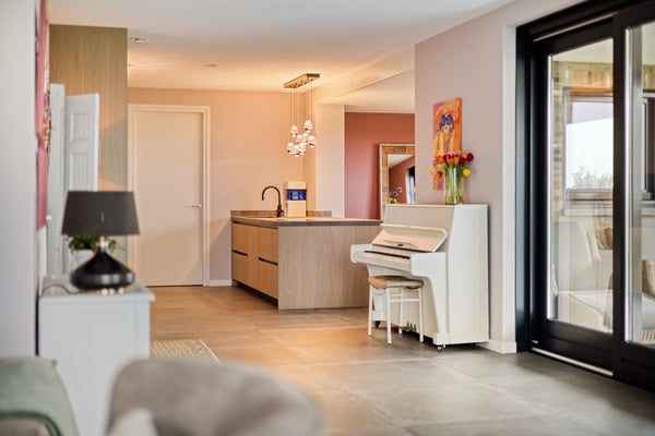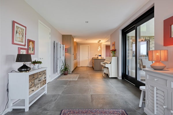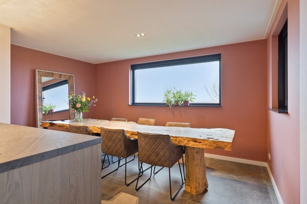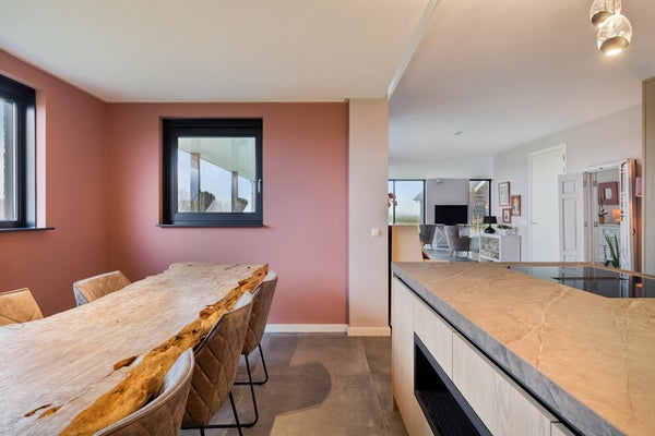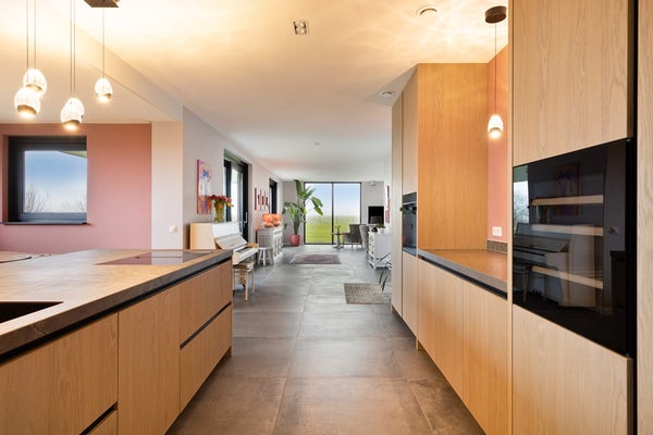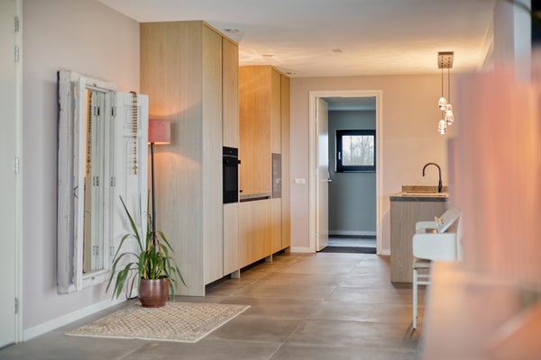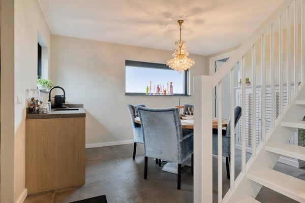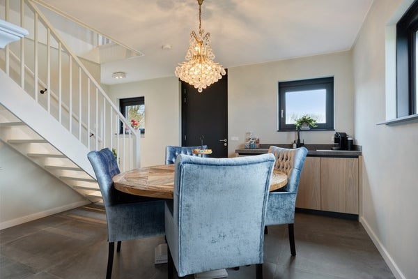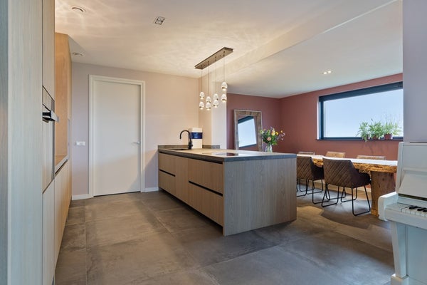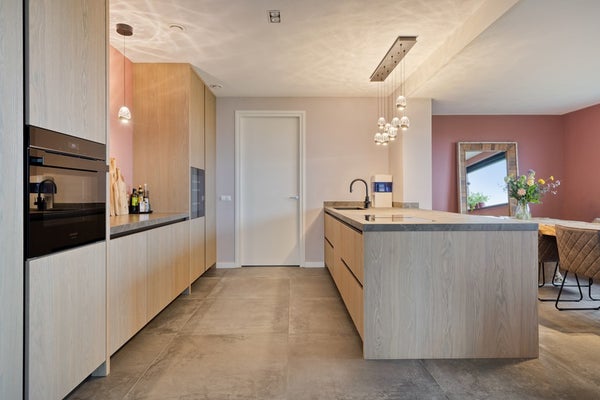 De royale woonkeuken is uitgevoerd met een maatwerk kastenwand en een centraal kookeiland met geïntegreerde inductiekookplaat met afzuiging. De keuken beschikt over hoogwaardige inbouwapparatuur, veel bergruimte en brede lades. Het eiland vormt een stijlvolle scheiding met de eetruimte en geeft de keuken een open, leefbare opzet. Grote raampartijen en warme materialen zorgen voor een sfeervolle, luxe uitstraling.