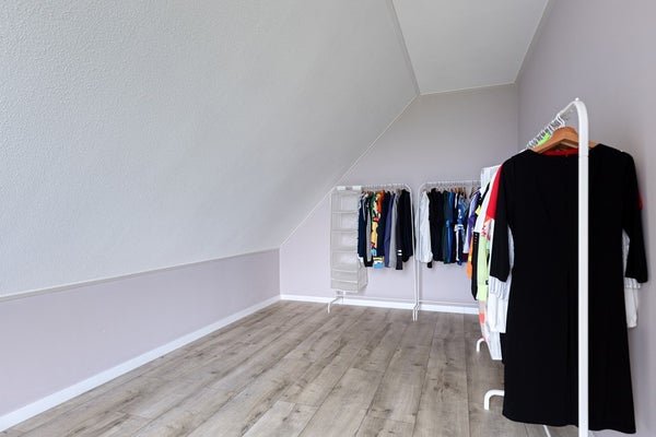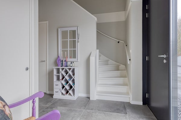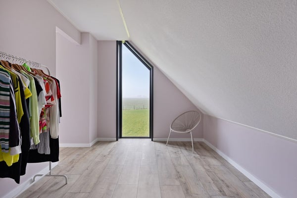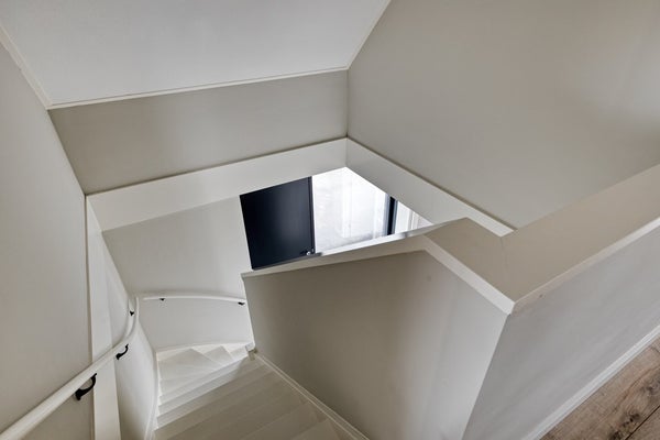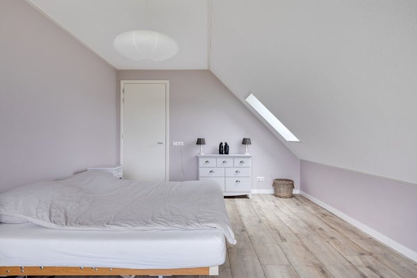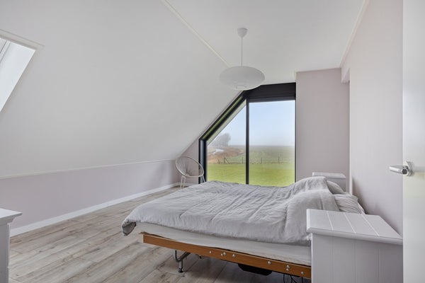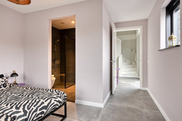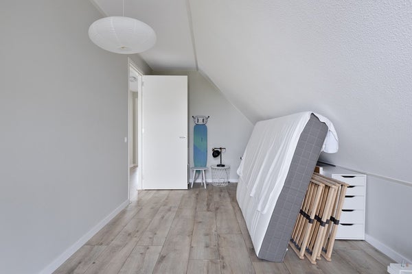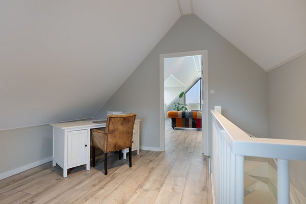 Op de verdieping bevinden zich meerdere slaapkamers en een tweede badkamer rond een centrale overloop met vide, wat zorgt voor extra licht en ruimtelijke beleving. De zolder biedt aanvullende bergruimte.