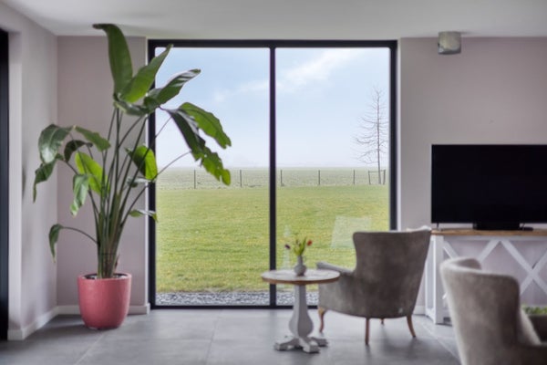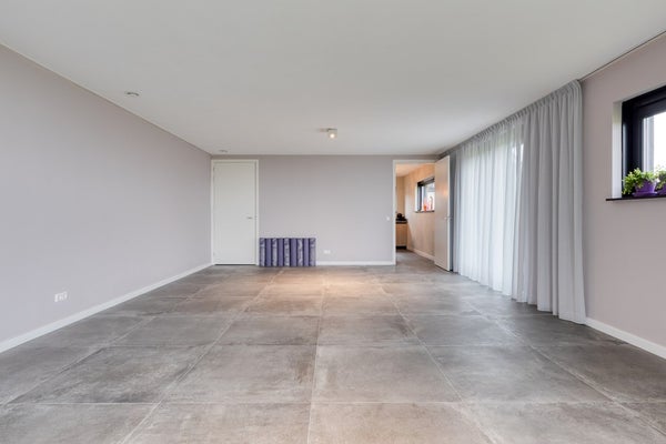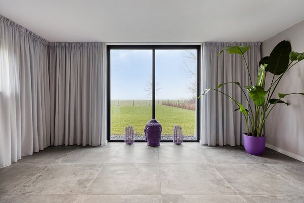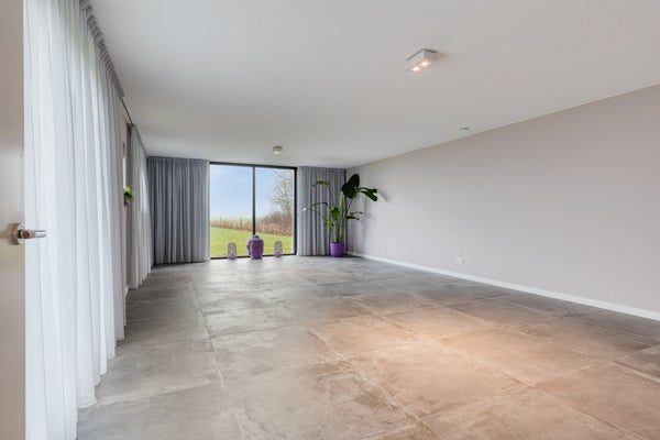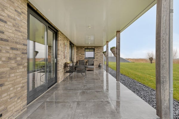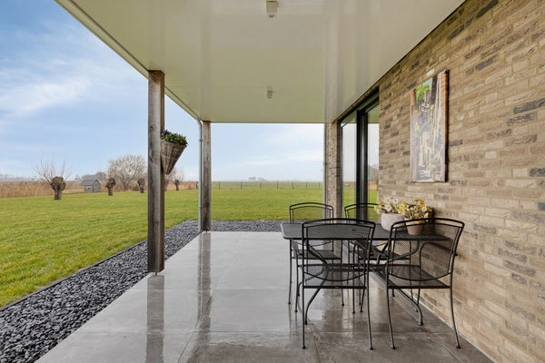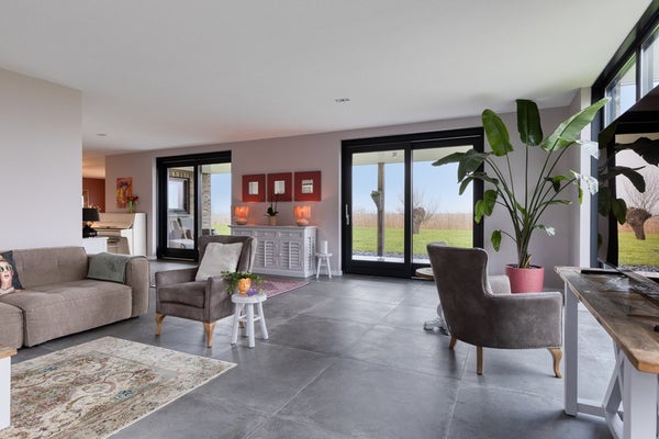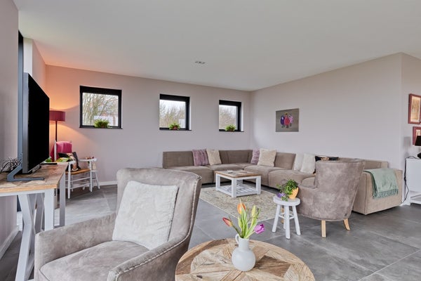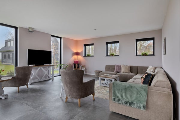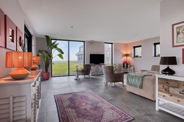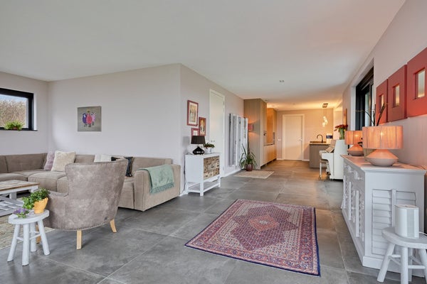 De hoofdwoning is ontworpen met oog voor comfort en ruimtelijkheid. De royale woonkamer met grote raampartijen biedt vrij uitzicht over het omliggende groen en staat in directe verbinding met de open keuken en het terras met overkapping.