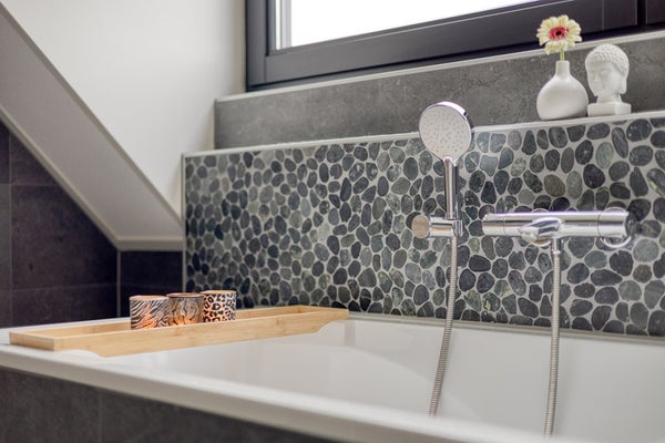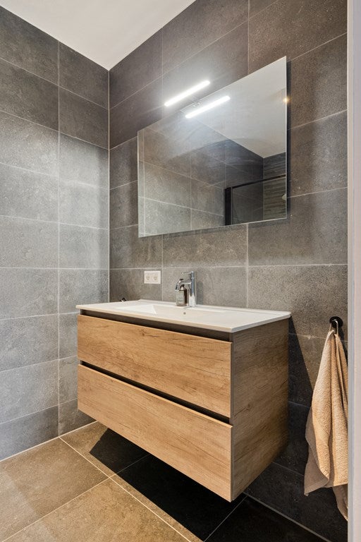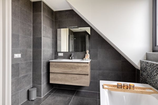 De stijlvolle badkamer op de verdieping is uitgevoerd in grootformaat antraciet/steenlook tegelwerk en beschikt over een ligbad onder het raam, een inloopdouche met glazen wand en thermostatische douche en een zwevend wastafelmeubel in houtdecor met brede lades en geïntegreerde wastafel. Het raam zorgt voor prettig daglicht en ventilatie, terwijl de schuine kap een sfeervolle, ruimtelijke uitstraling geeft. Een complete en luxe gezinsbadkamer.