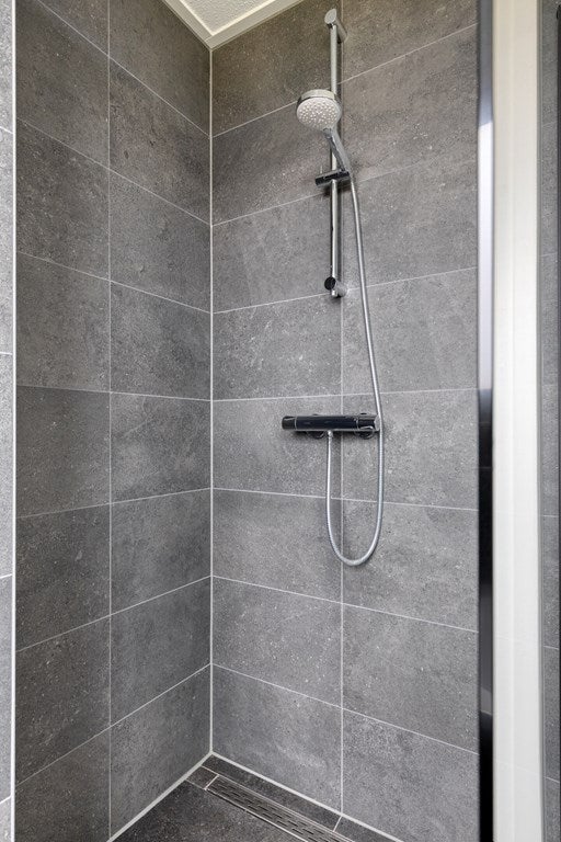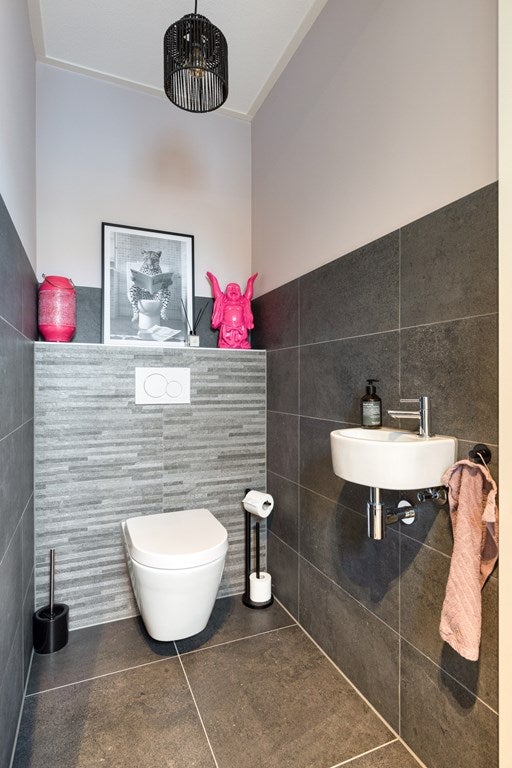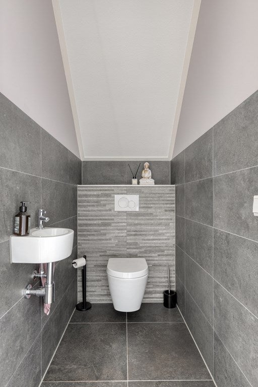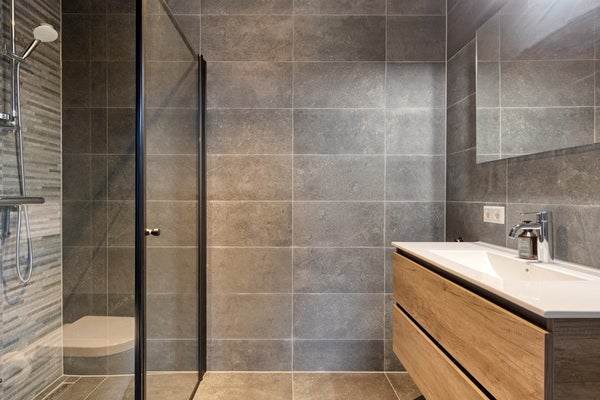 De moderne badkamer op de begane grond is volledig betegeld in grootformaat grijs-/steenlook en uitgevoerd met een inloopdouche met glazen wand en thermostatische regendouche. Het zwevende wastafelmeubel in houtdecor met brede lades en geïntegreerde wastafel zorgt voor een warme, luxe uitstraling. Daarnaast is de ruimte voorzien van een wandcloset en spiegel met verlichting. Een eigentijdse en onderhoudsvriendelijke badkamer, passend bij het comfort van gelijkvloers wonen.