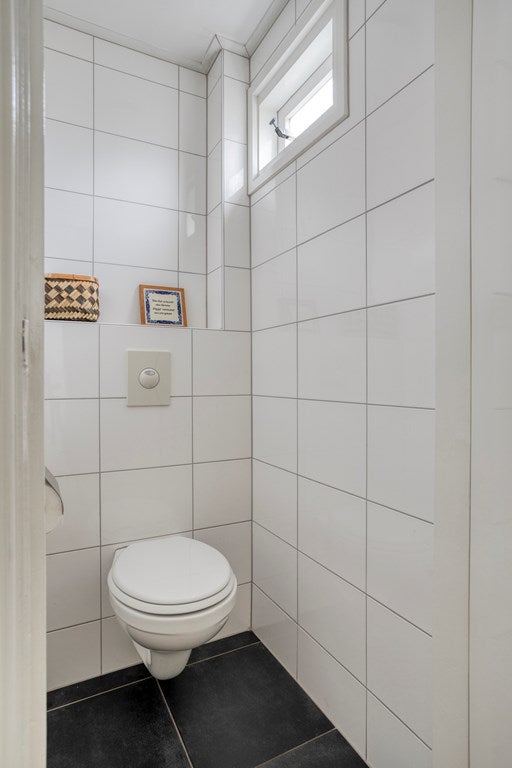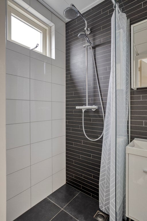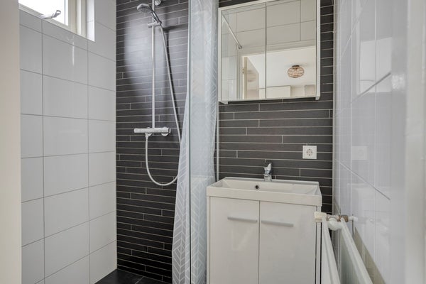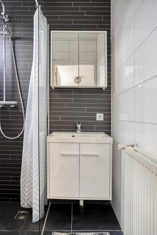 De badkamer (eveneens circa 2016) bevindt zich op de begane grond en is uitgerust met een douche, wastafelmeubel en radiator. Het toilet is separaat bereikbaar via de hal.