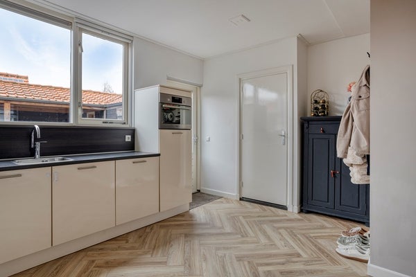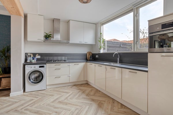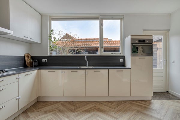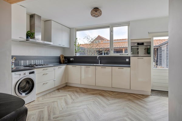De open keuken (circa 2016) is opgesteld in een praktische hoekopstelling en voorzien van diverse inbouwapparatuur, waaronder een gaskookplaat, vaatwasser, koel-/vriescombinatie en combimagnetron. Dankzij het grote raam is er prettig daglicht en uitzicht op de tuin.