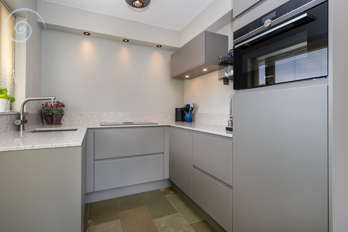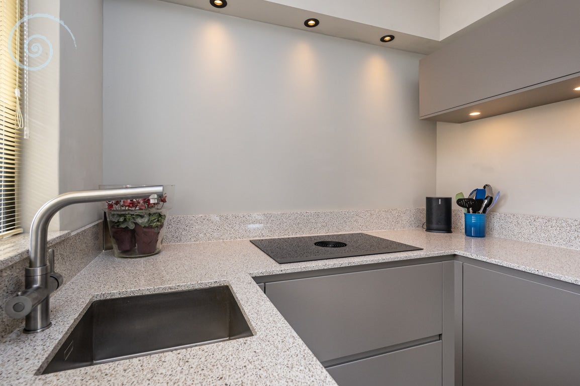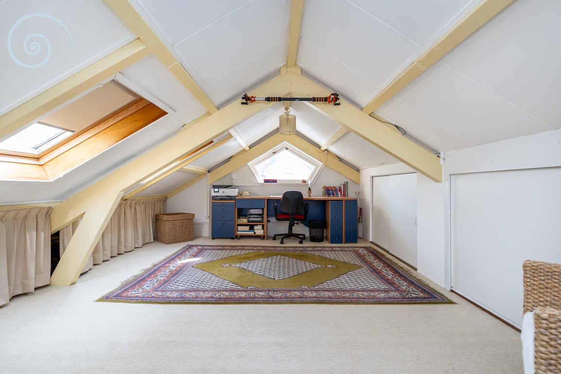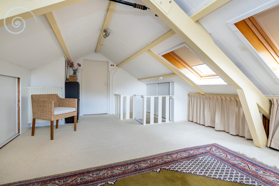 De begane grond heeft een entreehal die tot twee slaapkamers leidt, met een complete badkamer en een separate toiletruimte. De eerste verdieping biedt een lichte woonkamer met een balkon en een vernieuwde keuken met moderne apparatuur. Daarnaast is er een ruime slaapkamer met een tweede badkamer. Via een vaste trap bereik je de zolder, die kan dienen als hobby- of werkruimte.
