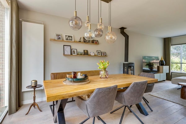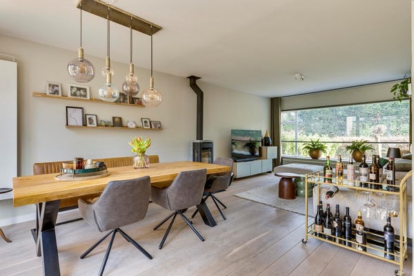 De woonkamer is een heerlijke leefruimte met een warme en moderne uitstraling. De houten vloer, hoge plinten en het strakke stucwerk vormen een stijlvolle basis. Centraal staat de sfeervolle houtkachel (TO). Aan de achterzijde bevindt zich het eetgedeelte met openslaande deuren naar de tuin – een prachtige verbinding tussen binnen en buiten. Bij de grote pui is bovendien een zonnescherm aanwezig.