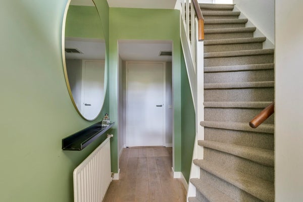 Via de onderhoudsvriendelijke voortuin bereikt u de overdekte entree. De ontvangsthal is voorzien van een houten vloer, strak stucwerk en hoge plinten. Hier vindt u de trapopgang, de deels betegelde toiletruimte met vrijdragend toilet en fonteintje, garderoberuimte en een praktische verdiepte trapkast.