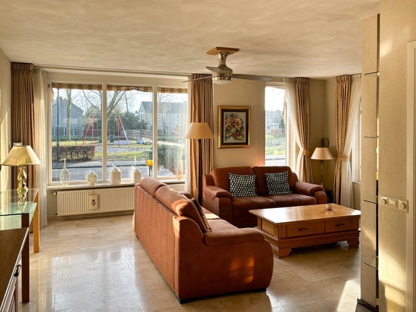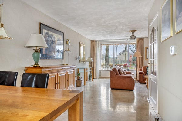 De woonkamer is uitgevoerd in L-vorm, met aan de voorzijde het zitgedeelte, deze beschikt over een sfeervolle gashaard. Grote raampartijen bieden zorgen voor veel lichtinval en een fraai vrij uitzicht. Aan de voorzijde zijn er sfeervolle markiezen aanwezig en een zonnescreen bij het zijgevelraam. Aan de achterzijde stapt u via de dubbele tuindeuren zo het overdekt terras in.