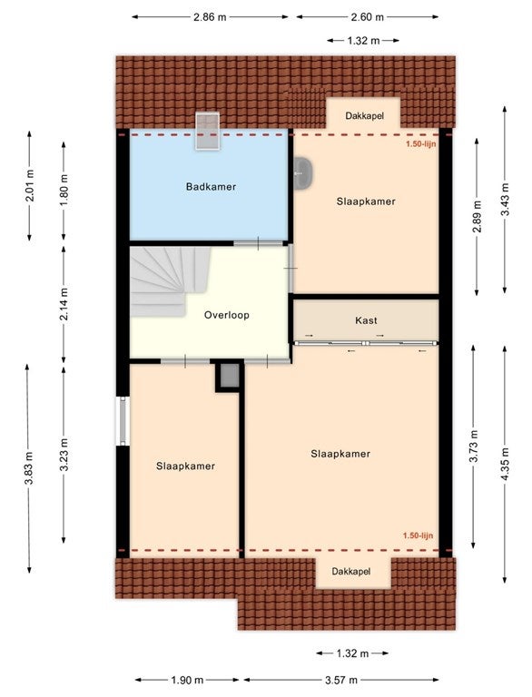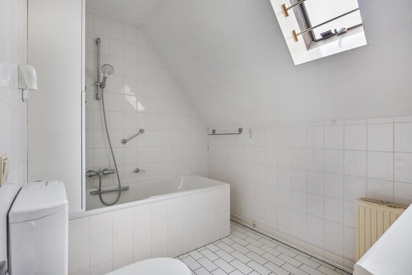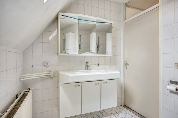 Via de vaste trap bereikt u de 1e verdieping. De overloop is netjes afgewerkt met een laminaatvloer en spachtelputz wanden. Slaapkamer 1, momenteel ingericht als werkkamer, is voorzien van een laminaat vloer, gestucte wanden en zijgevelraam. Slaapkamer 2 is eveneens afgewerkt met een laminaat vloer en stucwerkwanden en beschikt over een dakkapel met vrij uitzicht aan de voorzijde. Extra fijn is de grote vaste kastenwand, die zorgt voor volop bergruimte. Ook is hier een handmatig bedienbaar rolluik aanwezig. Aan de achterzijde bevindt zich slaapkamer 3, eveneens keurig afgewerkt met een laminaatvloer, stucwerk wanden/plafond, een vaste wastafel en tevens een dakkapel. De badkamer is eenvoudig, grotendeels betegeld en beschikt over een ligbad met douchespatscherm, een wastafel met een dubbel meubel met spiegel, toilet en dakraam.