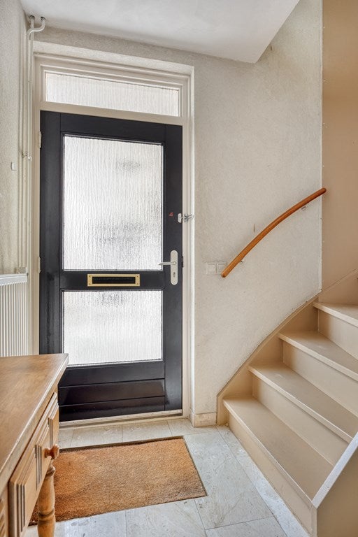 Via de oprit met overdekte entree bereikt u via de zijgevel de woning en stapt u binnen in de verzorgde ontvangsthal. Vanuit de hal heeft u toegang tot de woonkamer, toiletruimte en de trapopgang naar de verdiepingen. De toiletruimte is uitgevoerd met zowel vloer als wanden in natuurstenen tegels en voorzien van een vrijdragend toilet en een fonteintje.