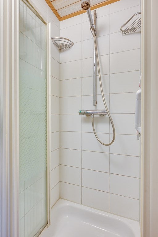 Aansluitend bevindt zich de doucheruimte, welke geheel is betegeld en is voorzien van een douchecabine en toilet met fonteintje.
