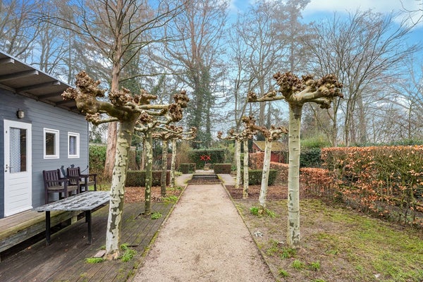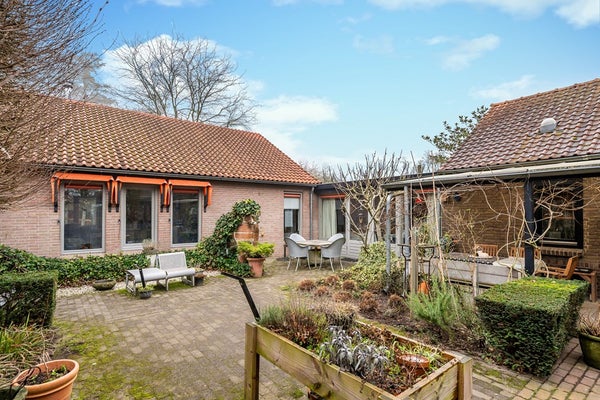 Uniek is de binnentuin die vanuit de keuken bereikbaar is. Deze sfeervolle buitenruimte beschikt over een groot overdekt terras, slingerende paadjes, beukenbomen en diverse vaste beplanting. Een beschutte plek waar u in alle rust kunt ontspannen en genieten van het buitenleven, ongeacht het seizoen.