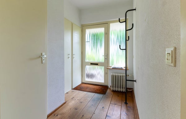 Via de voortuin bereikt u de overdekte entree. U komt binnen in de ontvangsthal, afgewerkt met een houten vloer, gestucte wanden en plafond. Hier vindt u de meterkast, een handige inbouwkast en een deels betegelde toiletruimte met staand toilet en fonteintje. De hal biedt toegang tot de woonkamer.