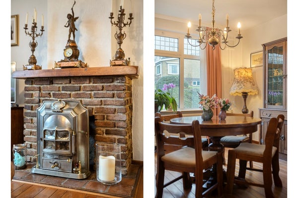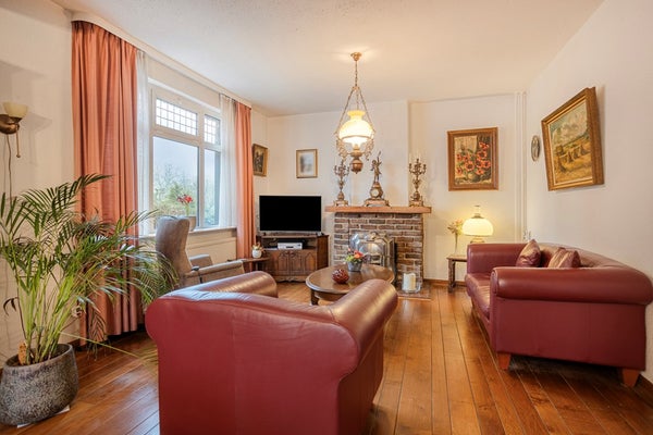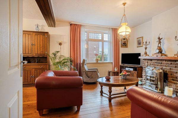 De woonkamer heeft een mooie raampartij aan de voorzijde en in de zijgevel. Tijdens het vervangen van de kozijnen is de traditionele vlakverdeling behouden gebleven. De woonkamer is voorzien van een parketvloer en een haard.