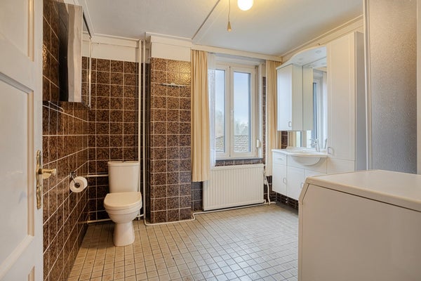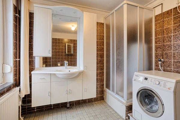 De ruime badkamer is uitgerust met een douchecabine, wastafelmeubel met wastafel en tweede toilet. Tevens bevindt zich hier de aansluiting voor de wasmachine.
