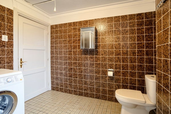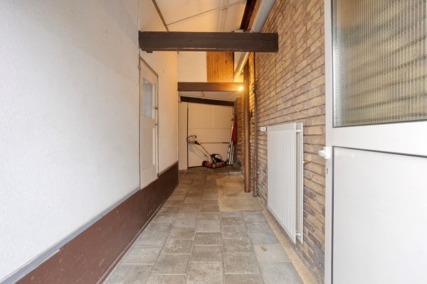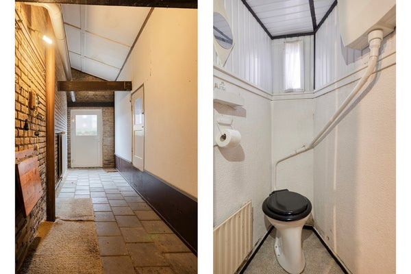 Vanuit de keuken bereikt men een tussenportaal, dit geeft toegang tot een ruime berging, de toiletruimte en de tuin. De toiletruimte is eenvoudig te noemen. De mogelijkheid bestaat om dit deel van de woning bij de leefruimtes te trekken waardoor er meer woonoppervlakte ontstaat.