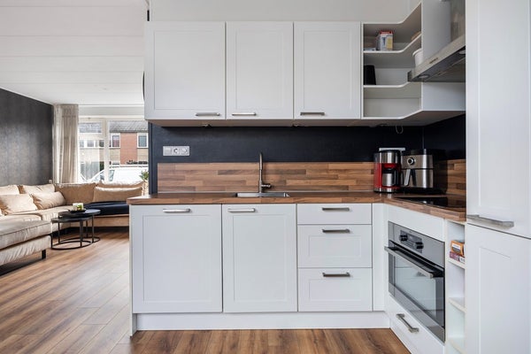 Je komt binnen in de entree met toilet, trapopgang en handige kastruimte. Vanuit hier loop je door naar de lichte woonkamer, waar grote ramen zorgen voor een prettige lichtinval en een gezellige leefruimte. De woonkamer staat in open verbinding met de keuken, die is uitgevoerd in een praktische opstelling en van alle gemakken is voorzien. Aansluitend vind je de bijkeuken met extra bergruimte en een directe doorgang naar de achtertuin. De achtertuin is volledig omheind, onderhoudsvriendelijk ingericht en beschikt over een berging – ideaal voor fietsen en tuingereedschap.