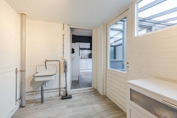 Bijkeuken met wasmachine-/drogeraansluitingen, laminaat vloer en deur naar de tuinkamer