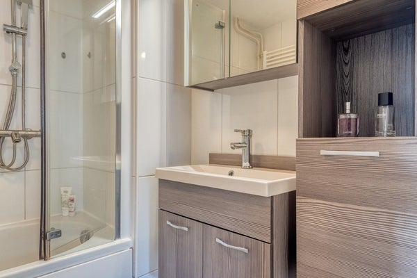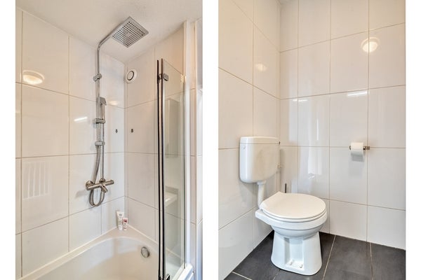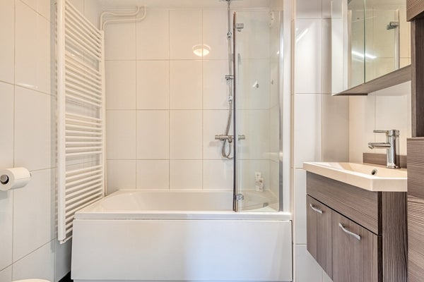 Kom na een dag werken tot rust in de badkamer. De badkamer is afgewerkt met een betegelde vloer, betegelde wanden en een spuitwerk plafond. De badkamer is voorzien van een 2e toilet, wastafel, ligbad met douche en mechanische ventilatie.