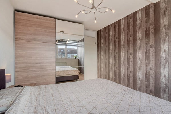 Slaapkamer 1, aan achterzijde gelegen, is afgewerkt met een laminaat vloer, behangen wanden en een spuitwerk plafond. De slaapkamer is voorzien van een handmatig rolluik.