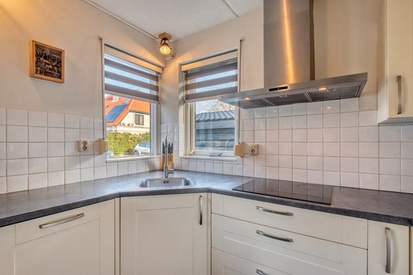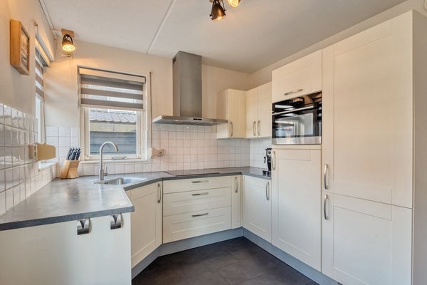 Deze heerlijke keuken nodigt uit tot culinaire avonturen en gezellige momenten samen. De half open keuken is afgewerkt met een betegelde vloer, betegelde wanden en een spuitwerk plafond. De in een hoek opgestelde keukeninrichting is voorzien van onder- en bovenkastjes, ingebouwde koelkast en vriezer, inductie kookplaat, vaatwasser, combi-oven, spoelbak. De keuken is voorzien van een handmatig rolluik.