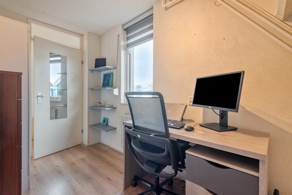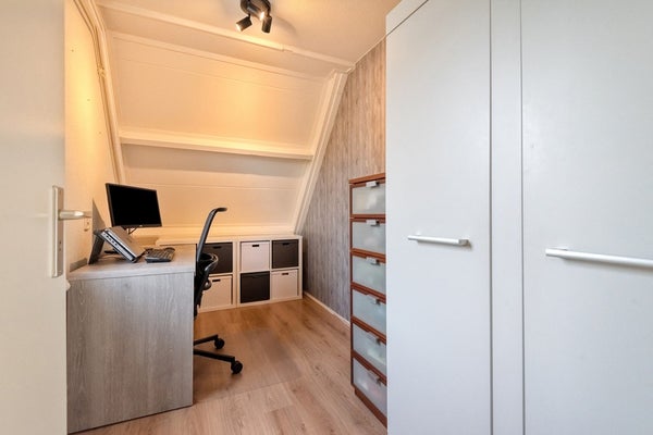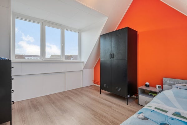 Slaapkamer 4 is afgewerkt met een laminaat vloer, spachtelputz wanden en een gesaust plafond. De slaapkamer is voorzien van een kunststof dakkapel met elektrisch rolluik en een dakraam.