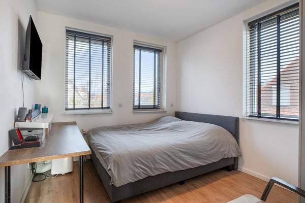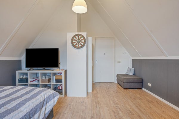 Slaapkamer 4 is afgewerkt met een laminaat vloer, gesauste wanden en plafondplaten. De slaapkamer is voorzien van een knieschotkast.