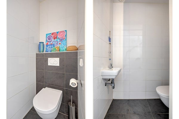 Geniet van pure ontspanning in het comfortabele ligbad. De badkamer is afgewerkt met een betegelde vloer, betegelde wanden en een spuitwerk plafond. De badkamer is voorzien van een modern wastafelmeubel met dubbele wasbakken, ligbad, inloopdouche en radiator.