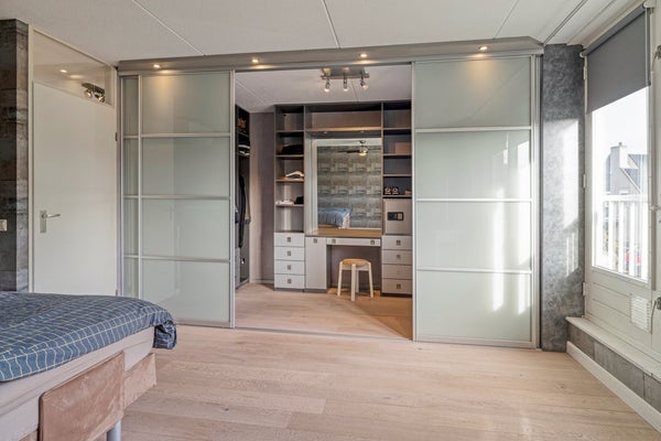 Slaapkamer 1 is afgewerkt met een parketvloer, behangen wanden en een spuitwerk plafond. De slaapkamer beschikt over een frans balkon, airconditioning en luxe inloopkast met 2 schuifdeuren.