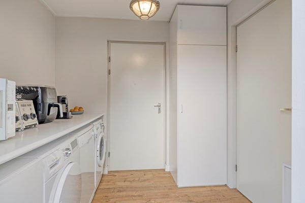 De bijkeuken is afgewerkt met een laminaat vloer, gestucte wanden en plafondplaten. De bijkeuken is voorzien van de aansluiting voor wasmachine en droger. Vanuit de bijkeuken is er toegang tot de garage en de achtertuin.