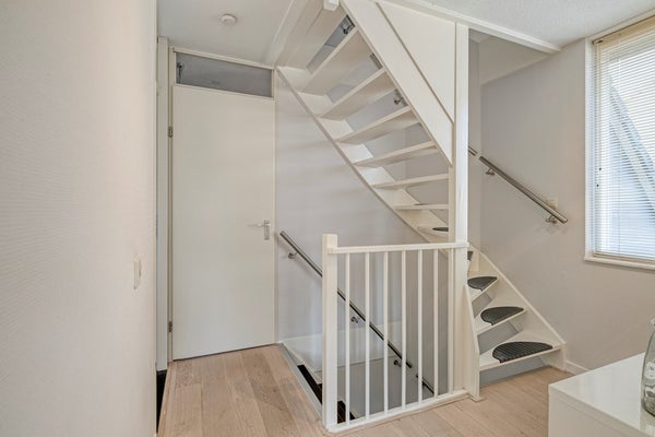 Middels de vaste trap op de begane grond bereiken jullie de overloop op de eerste verdieping. De overloop is afgewerkt met een parketvloer, behangen wanden en een spuitwerk plafond. De overloop biedt toegang tot twee ruime slaapkamers, de badkamer en de tweede verdieping middels een vaste trapopgang.