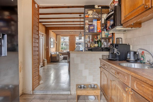 Entree / hal met meterkast en trapopgang. De woonkamer beschikt over een gashaard en aan de achterzijde de keukenopstelling met een gaskookplaat en een afzuigkap. Via een halletje bereikt u het toilet en de achtertuin. De badkamer is bereikbaar vanuit de keuken en voorzien van een wastafel en een ligbad met douche.