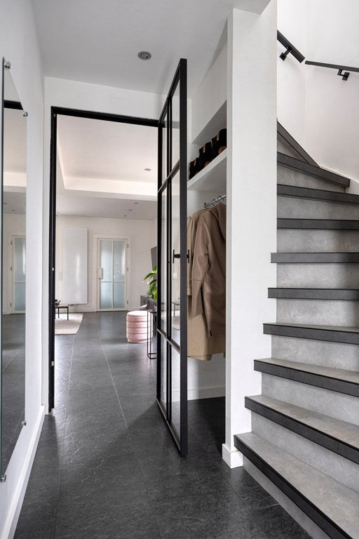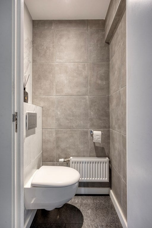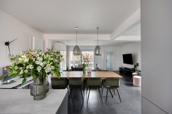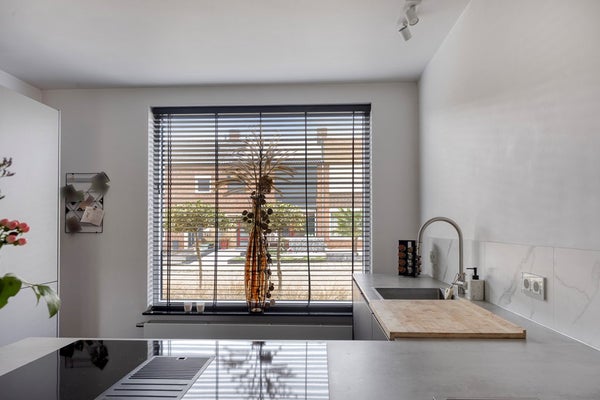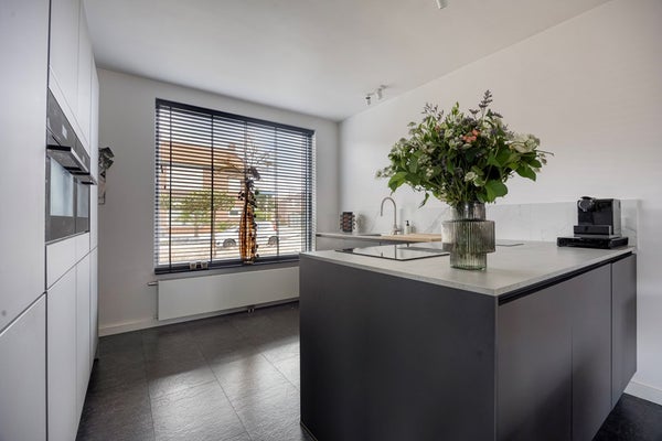 Fraaie hal met pvc vloer, garderobe, meterkast (voorzien van 3-fase), toegang naar de living, trap naar eerste verdieping en het geheel betegelde gastentoilet voorzien van verwarming. Bij binnenkomst in de royale living ,middels de stalen deur, valt direct de lichte en sfeervolle leefruimte op, waar wonen en eten naadloos in elkaar overlopen. De stijlvolle, moderne keuken is uitgevoerd in een praktische wandopstelling met onderkasten en loopt door in een L-vormig keukenblok. Dit zorgt niet alleen voor een ruimtelijk gevoel, maar ook voor een efficiënte en comfortabele werkruimte. Het L-gedeelte is voorzien van een rvs spoelbak, vaatwasser en een 4-pits inductiekookplaat met geïntegreerde afzuiging. Het robuuste betonlook werkblad geeft de keuken een stoere, eigentijdse uitstraling en is tegelijkertijd onderhoudsvriendelijk. Aan de overzijde bevindt zich een royale kastenwand met een hoge koelkast, oven en combimagnetron. Alle inbouwapparatuur is van het hoogwaardige merk AEG, wat garant staat voor kwaliteit, gebruiksgemak en duurzaamheid. Aangrenzend aan de living is de bijkeuken, hier bevinden zich de aansluitingen voor het witgoed en de Remeha Avanta cv-ketel. Zowel vanuit de bijkeuken als de living is de achtertuin bereikbaar.