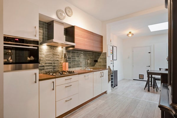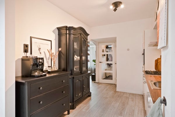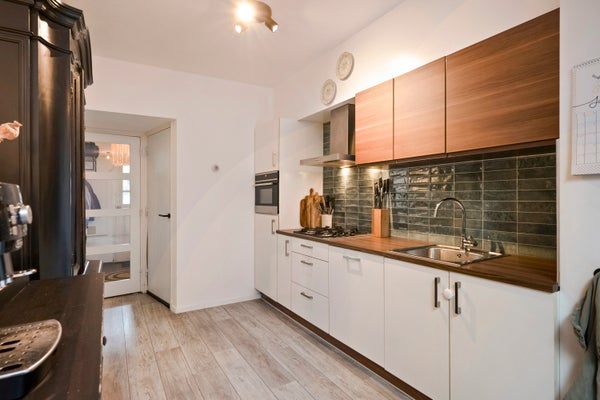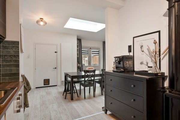 Daarnaast is er een toegang naar de berging/bijkeuken, waar het witgoed staat, de cv-installatie is geplaatst en voldoende ruimte is voor opslag van andere spullen.