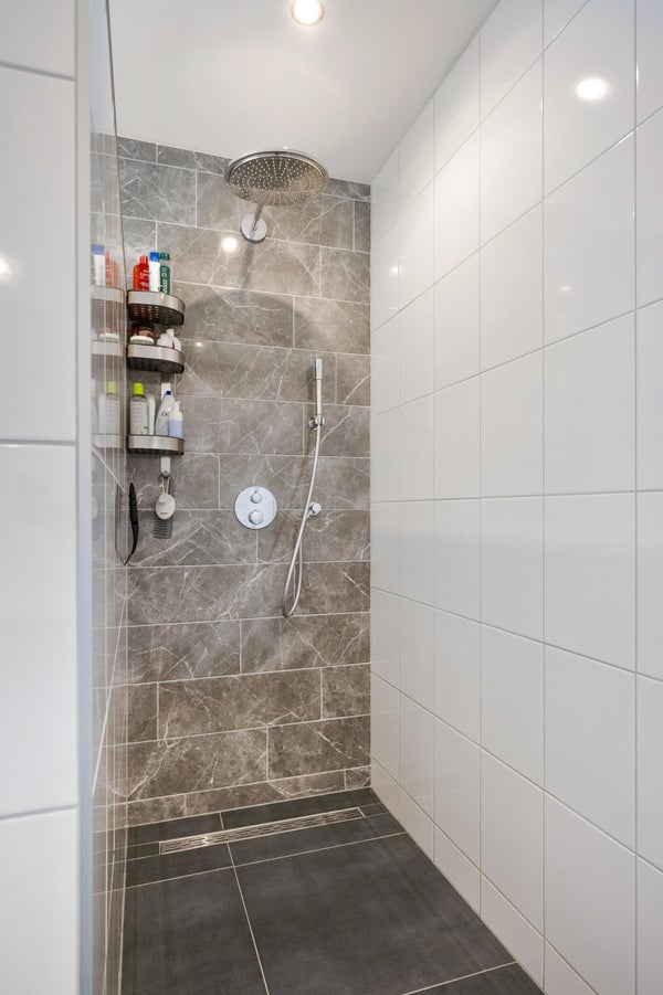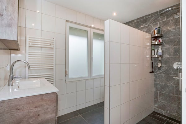 De ruime en luxe badkamer is volledig betegeld en voorzien van een heerlijke inloopdouche met regendouche, een toilet en een wastafel met meubel.